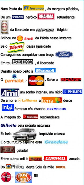 Veja a seguir um exemplo nada sutil de merchandising no Hino Nacional Brasileiro. Agora vai ser fácil dos jogadores da seleção brasileira cantarem o hino…